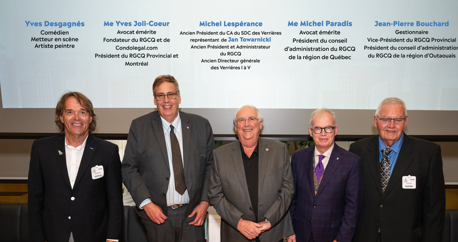 Nous tenons également à saluer la participation à cette soirée historique du fondateur et président du RGCQ provincial et Montréal, l'avocat émérite Me Yves Joli-Cœur, ainsi que celle de M. Jean-Pierre Bouchard, gestionnaire et vice-président du RGCQ provincial et président du RGCQ région Outaouais ; Me Michel Paradis, avocat émérite et président du RGCQ région de Québec et M. Jan Towarnicki, ancien président et administrateur du RGCQ, représenté Michel l’Espérance par lors de cette soirée.