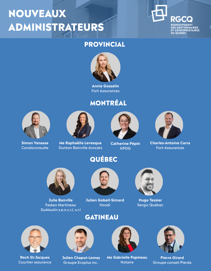 Œuvrant à l’amélioration de la gouvernance en copropriété et à la promotion des meilleures pratiques dans ce domaine, le RGCQ peut compter sur l’expertise et l’engagement de ces nouveaux administrateurs et administratrices pour poursuivre sa mission : soutenir une gestion saine, responsable et éthique des copropriétés partout au Québec.