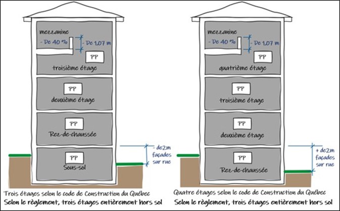 Par ailleurs, certaines mezzanines ne sont pas considérées comme un étage. Le Code de construction permet de ne pas considérer l’es pace situé au-dessus d’une mezzanine comme un étage dans le calcul de la hauteur de bâti ment, si cet espace est aménagé selon les critères suivants :