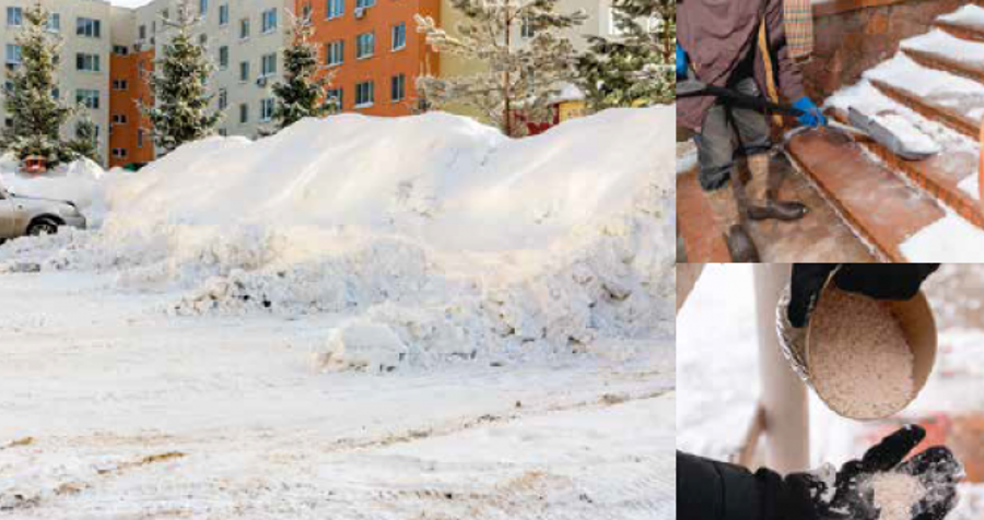 Beyond the snow removal service, it is important to keep outdoor surfaces safe and free of snow accumulation - and not slippery! Slipping or losing one’s footing, even if the sidewalk or driveway is cleared of snow, can be unexpected and can result in injury to both homeowners and visitors. But between rain, snow, ice and rapidly changing weather, what are the options? To be well prepared, and depending on the use and the surface, it is important to choose the right abrasive or de-icing product (de-icer) and, ideally, the one that will be the least harmful to the environment … and the co-ownership.